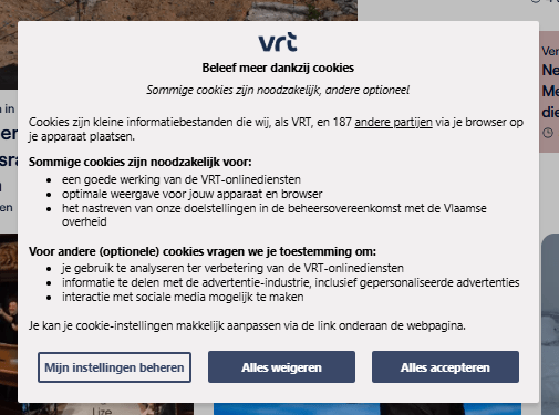 Het beste dat je dus kunt doen, is kiezen voor ‘instellen‘ of ‘instellingen beheren’ of iets met die woorden. Je kiest vervolgens zelf welke cookies je wel en niet wilt aanvaarden.